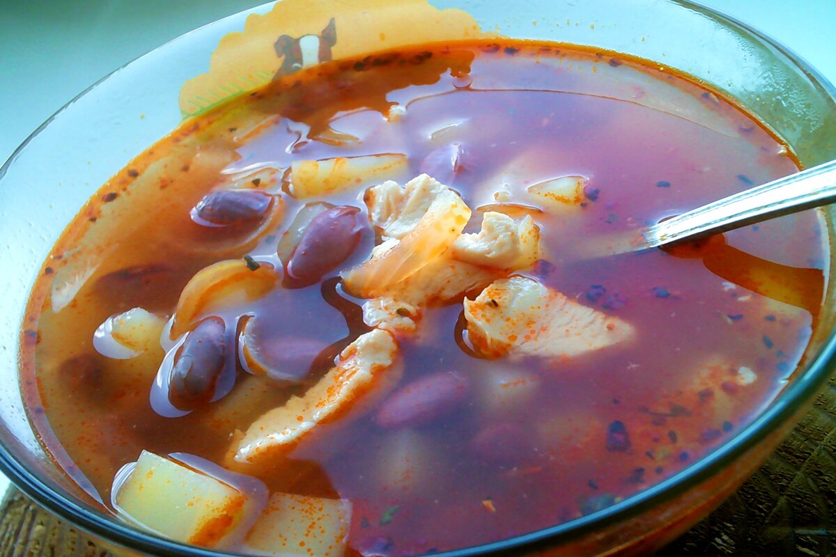 Нам понадобится: Всё нарезаем кубиком(ну,что можно). Отвариваем кусочки курицы, добавляем (заранее)отваренную фасоль, и сразу же кубики картофеля. Варим до готовности.Пока быстро добавляем на сковороду( лук,чеснок,пасту).Тушим 1,5 минуты и в суп. Соль+перец по вкусу. Для любителей острого,можно добавить красный перец(овощ). Так же,хорошо подойдут гренки(желательно чёрного хлеба). Приятного и вкусного супа!