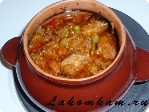 Блюдо из мяса «Гювеч». Ингредиенты: мясо — 200 грамм; сливочное масло — 30 грамм; заготовка «Гювеч» — 5 столовых ложек.