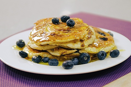 Американские блинчики-панкейки (pancakes) по толщине и воздушности похожи на наши оладушки. Однако чужеземное происхождение не делает их менее вкусными. Более того, в некотором смысле это те же блины с припеком, которые так любили на Руси. Ингредиенты: 150 мл молока, 3 яйца, 120 г муки, 1 чайная ложка разрыхлителя, 1 столовая ложка сахара, щепотка соли, горсть черники или голубики. Приготовление 1. Белки отделить от желтков. Взбить белки с сахаром и солью до устойчивой пены. 2. В миску просеять муку с разрыхлителем. Добавить желтки, влить молоко, перемешать до однородного состояния. 3. Аккуратно, «ленивыми» движениями, вмешать белки. 4. Сковородку смазать сливочным маслом. Налить половник теста, посыпать черникой. Перевернуть и готовить до румяности. Блинчики полить медом. Готово! Приятного аппетита!