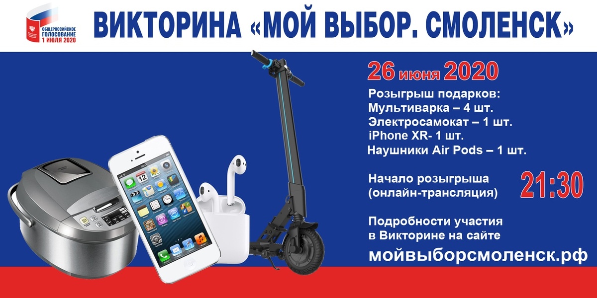 Напомним, накануне, 25 июня, стартовала викторина «Мой выбор. Смоленск». Первые победители уже определены, но впереди еще очень много интересных вопросов и ценных подарков. До 1 июля включительно смоляне могут проверить знание Конституции Российской Федерации и принять участие в викторине, главными подарками в которой станут 2 автомобиля - LADA X-RAY и «Шевроле Нива». Их разыграют 27 июня и 1 июля, а в остальные дни проходят розыгрыши других подарков: смартфонов iPhone, беспроводных наушников AirPods, роботов-пылесосов, мультиварок, электросамокатов и велосипедов. Участниками викторины могут стать граждане Российской Федерации в возрасте от 18 лет, проживающие в Смоленской области и вступившие в группу «Мой выбор. Смоленск» в одной из социальных сетей... Полная версия статьи: https://smolgazeta.ru/daylynews/76972-viktorina-moy-vybor-smolensk-nabiraet.html