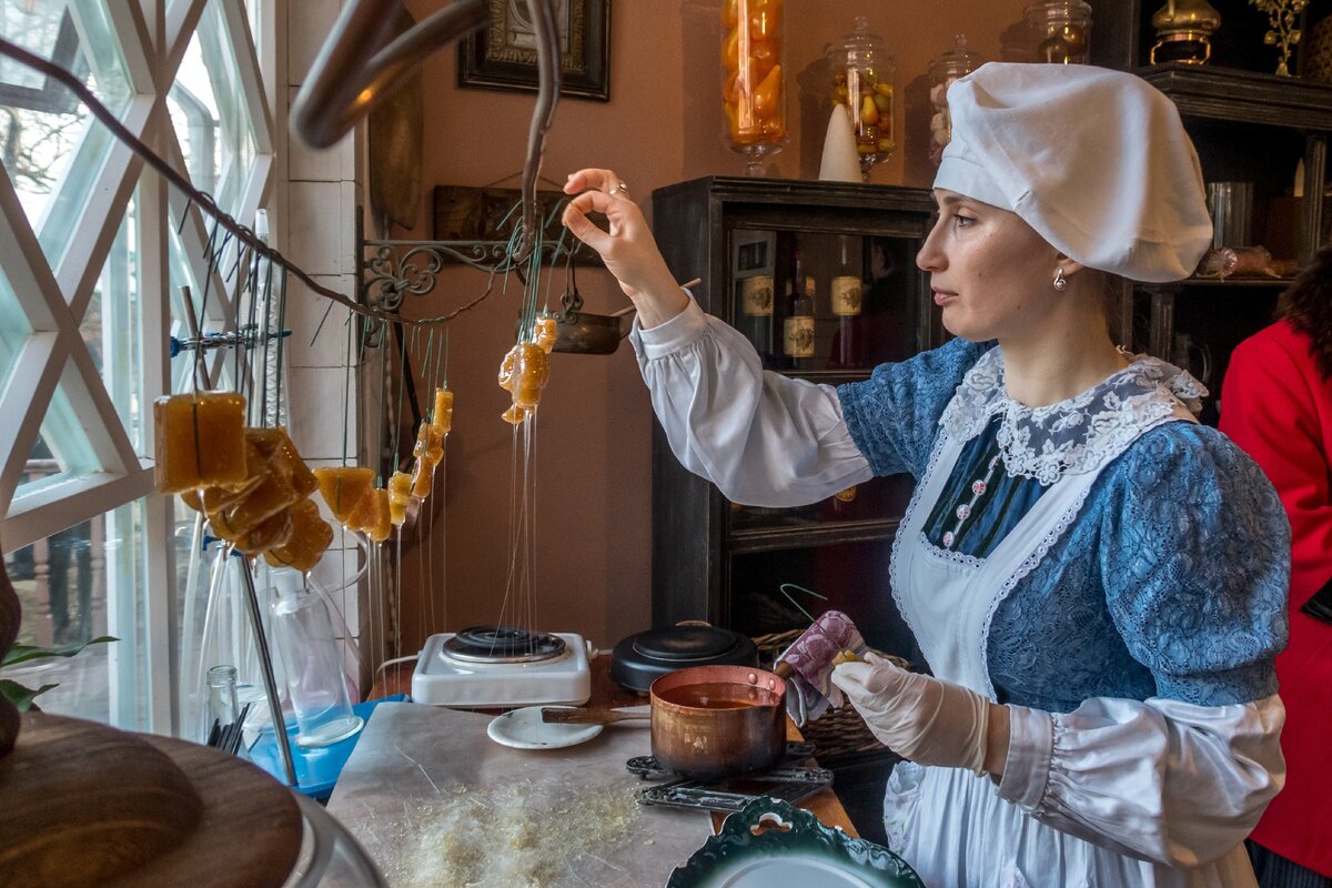 Программы в обоих музеях очень крутые. И сложно сказать, где лучше. На фабрике пастилы всё построено на перемещении по дому: надо постоянно переходить из комнаты в комнату, и это здорово — ты видишь, как в разных помещениях происходили разные стадии пастильного производства.