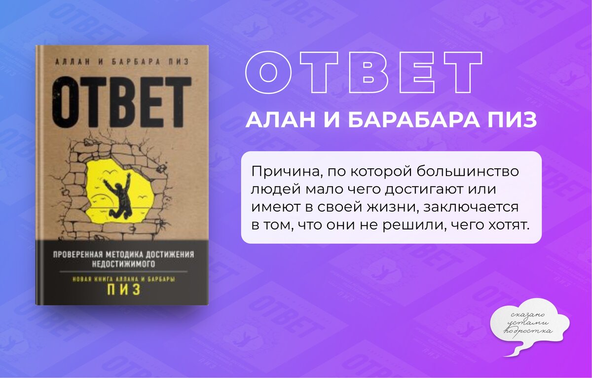 Люди всегда читали книги, ходили в библиотеки и интересовались литературой. Интересы и писатели менялись поколениями, стили тоже. Сейчас нет ни одного книжного магазина, где вы ни встретите мотивационно-психологическую литературу. Основная цель авторов подобных книг донести свой опыт до читателя, замотивировать на новые свершения и доказать, что возможно все. Я составила список из 3 книг, которые способны изменить ваше мышление и подтолкнуть к действию. 1. «Ответ» Алан и Барбара Пиз Одна из лучших мотивационных книг. Авторы не просто делятся инструментами, которые использует для улучшения своего бытия, но и рассказывают фрагменты жизни, которые замечательно дополняет информацию. Есть вопрос? Здесь вы точно найдете ответ. Эта книга стала отправной точкой моего развития. Я делала заметки около текста, выделяла цитаты, а самое главное внедряла и развивалась дальше. Это книга действительно worth reading! 2. «Ни Сы» Джен Синсеро Дерзкая! Именно это слово может четко характеризовать книгу и