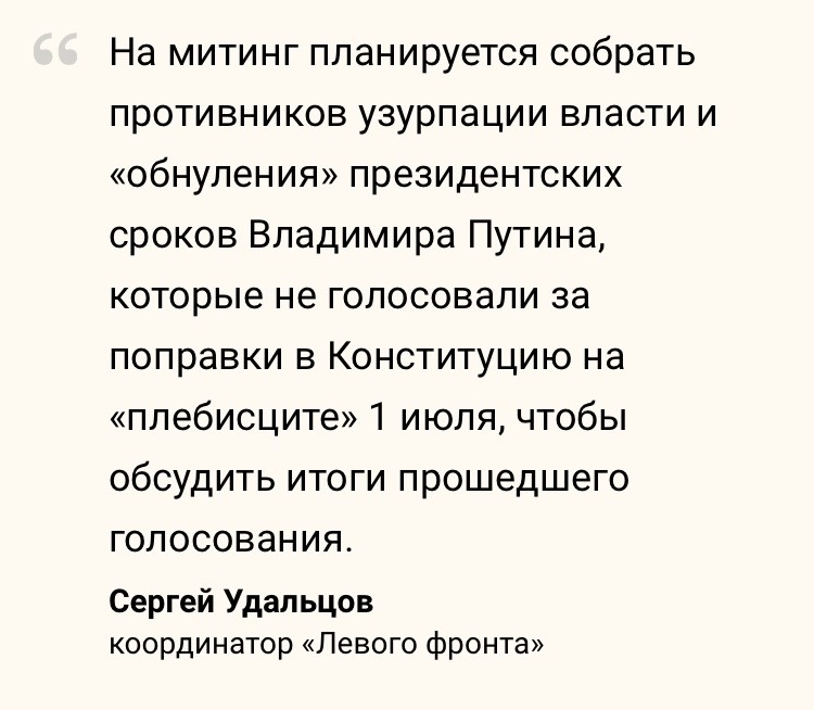 Митинг пройдёт уже после голосования под лозунгом «Мы не голосовали за обнуление Путина!» Мэрия согласовала митинг «Левому фронту». Эта акция станет первым митингом против вносимых в основной закон страны изменений. Она пройдёт 4 июля в гайд-парке в Сокольниках. Заявленная численность участников, с учётом социальной дистанции, тысяча человек. Какой толк от митинга в 1000 человек в гайд-парке, ещё и после голосования? Никакого. Поэтому и согласовали.