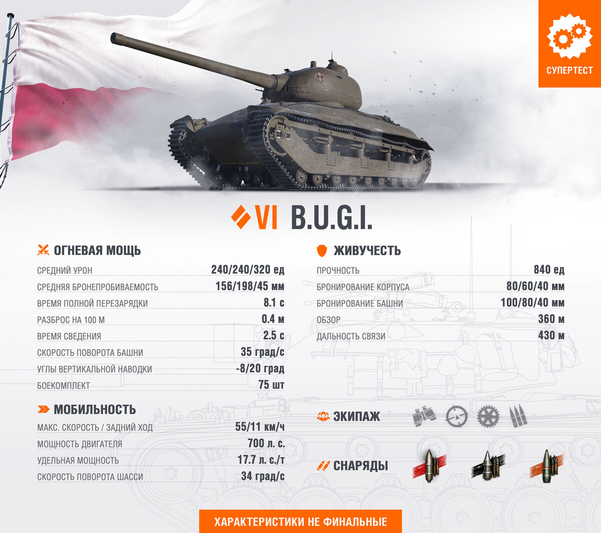 С точки зрения геймплея новые машины польской ветки похожи на советские аналоги, однако фирменная черта польских тяжёлых танков в виде высокого разового урона прослеживается и у них, особенно при использовании орудий более высокого калибра. Это во многом универсальные машины, обладающие хорошей подвижностью (максимальная скорость – от 55 км/ч у B.U.G.I. до 57 км/ч у CS-44) и стандартным для средних танков уровнем защищённости. Их можно сравнить с веткой советских средних танков, а именно Т-34, Т-34-85 и Т-43: та же компоновка с передним расположением башни, схожие подвижность и живучесть.