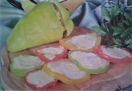 Ингредиенты: перец - 3 шт. твердый сыр - 150 гр. яйцо - 3 шт. майонез чеснок - по вкусу Приготовление: Моем перцы и вырезаем сердцевины. Натираем сыр, затем добавляем в него майонез и чеснок пропущенный через пресс. Майонеза добавлять немного, чтобы масса не получилась жидкой. В каждый перец закладываем целиком сваренное в крутую яйцо, а вокруг добавляем сырную массу. Ставим перцы в холодильник на 3 часа, чтобы сыр застыл. Перед подачей нарезаем кружочками тонким острым ножом смоченным холодной водой. Приятного аппетита!