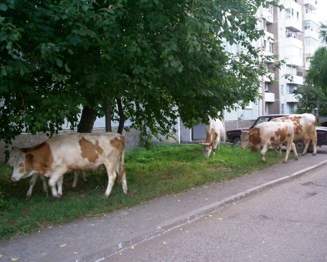 Вот наш город называют большой деревней! Круто, когда ты заходишь за угол, а там вот такое чудо Это неизбежно, когда частный сектор находится рядом с нашим человейником. Но только очень интересно, что бедным коровкам приходится питаться не очень чистой и полезной травушкой. Это наши соседи))))