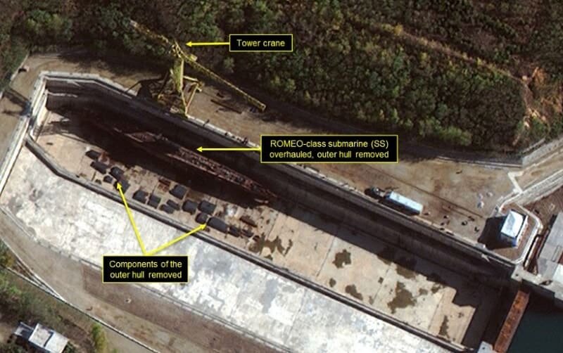 В пятницу пришли новые интересные фотографии с спутников - шпионов, контролирующих территорию Северной Кореи, с виду обычные фотографии, но эксперты утверждают, что Корея создает новое вооружение. Внимание военных экспертов привлекли несколько фотографий, сделанных в разное время, на которых отчетливо видно, что военное предприятие строит подводную лодку, видны элементы конструкции и их постепенный монтаж в сухом доке, по всей видимости, строящаяся подводная лодка относится к классу «Ромео», по классификации НАТО. Такие подводные лодки считаются устаревшими, в Советском Союзе субмарины такого класса производились и эксплуатировались с вплоть до 1961 года, в последствии они были заменены на более современные, атомные подлодки. На сегодняшний день в России эти подлодки используются в качестве учебных. Кроме, непосредственно фотографий, строящейся подлодки есть еще одна непримечательная фотография, на которой военные эксперты обнаружили испытательный стенд, на котором, по всей видимости
