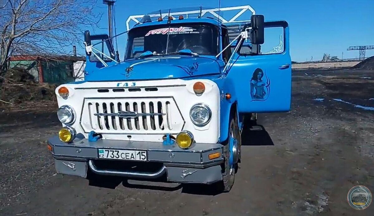 Приветствую вас, друзья! Не только на территории нашей необъятной проживают люди, которые из стокового грузовика могут сделать настоящий шедевр. В Казахстане находится вот такой интересный экземпляр ГАЗ-53. Двигатель здесь ТМЗовский, рессоры хозяин усилил по-полной. На грузовике стоит три бака: Один родной, другой под кузовом, а третий возле кабины, под кузовом. Резина не родная, а КАМАЗовская. Отдельное внимание стоит уделить салону. Здесь постарались на славу. Весь салон, включая крышу, обили новой тканью, а сиденья взяли от Фольцвагена. Их немного обрезали, для удобства установки в ГАЗ. Вообще, салон очень антуражный, как будто автомобиль прямиком с какого-нибудь сериала или фильма. Но вернемся к автомобилю. Коробка здесь стоит ЗИЛовская, а также гидроусилитель тоже с ЗИЛа. Как говорит хозяин этого грузовика, делал это авто он под себя, ездит на нем постоянно. Помогали ему отец и зять. Зять хороший электрик, поэтому именно он