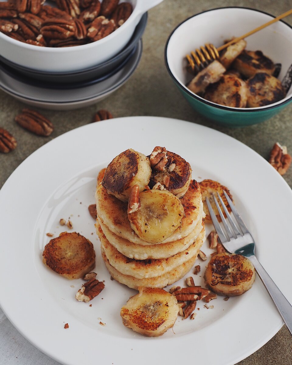 Когда сырники будут готовы, порезать второй банан кружочками и обжарить на той же скорода с двух сторон до румяного цвета