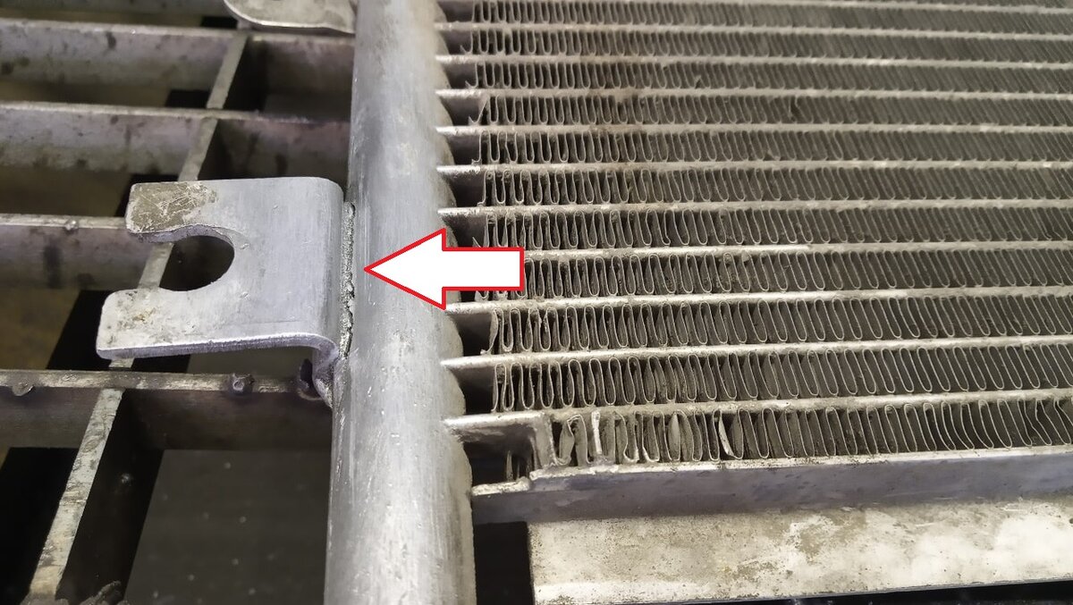 В нашу мастерскую обратился клиент с проблемой не работающего кондиционера на автомобиле шевроле. После детального осмотра подкапотного пространства была обнаружена трещина в радиаторе кондиционера. Причина появления трещины как было установлено позже являлась вибрационная нагрузка на кронштейн радиатора в следствии чего под кронштейном вдоль стыка трубки радиатора образовалась злосчастная