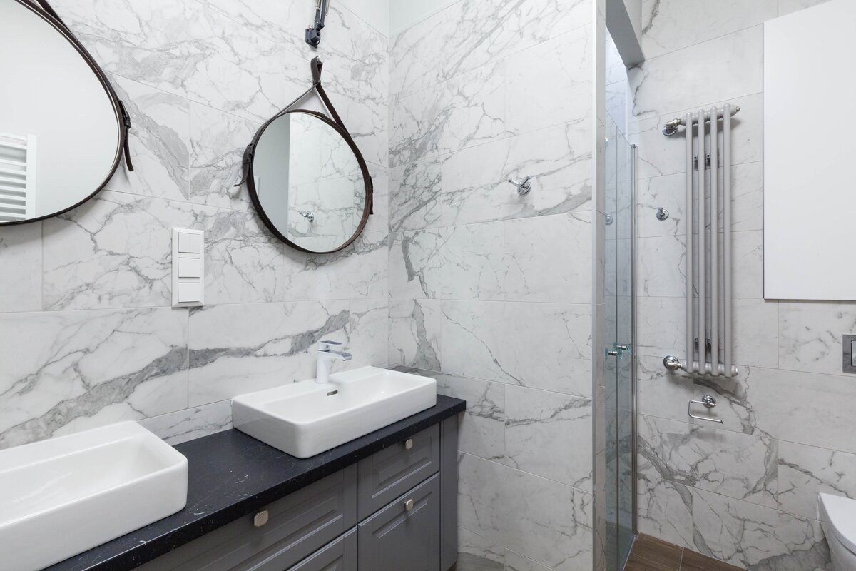▪️Зеркальный шкафчик — тоже очевидный вариант. Но не всегда очевидно, что важно соотнести глубину и высоту навески шкафчика с раковиной, смесителем и своим ростом. Обратите внимание на асимметричные варианты, в которых одна дверца шире другой. За узкой могут храниться предметы частого использования (зубные щетки и паста, например), а за широкой — те, что используются реже. Удобно чистить зубы, открыв только одну половину, а смотреться во вторую. Никаких лишних открываний-закрываний.