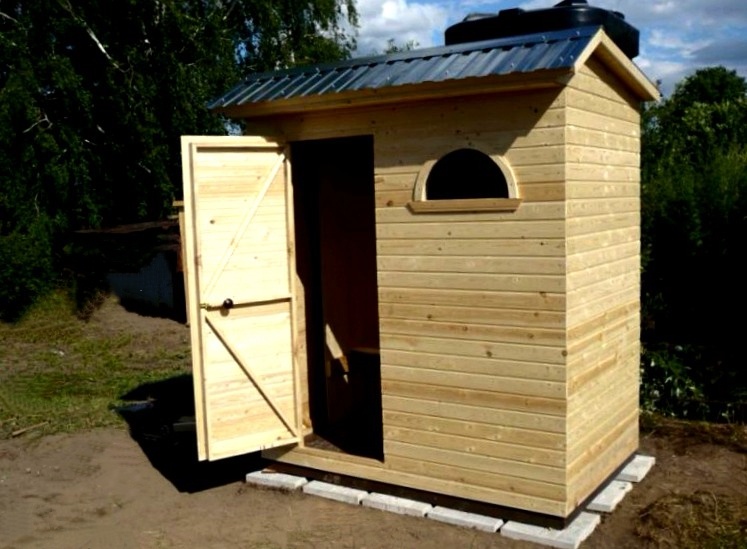 Обшить такую конструкцию, лучше всего вагонкой. Воздержитесь, от покраски, так как дерево должно дышать. К несущему столбу, с помощью петель на брус, который прикреплён за обшивку, необходимо навесить дверь. В стене обязательно должно быть окно, для проветривания душевой кабинки.