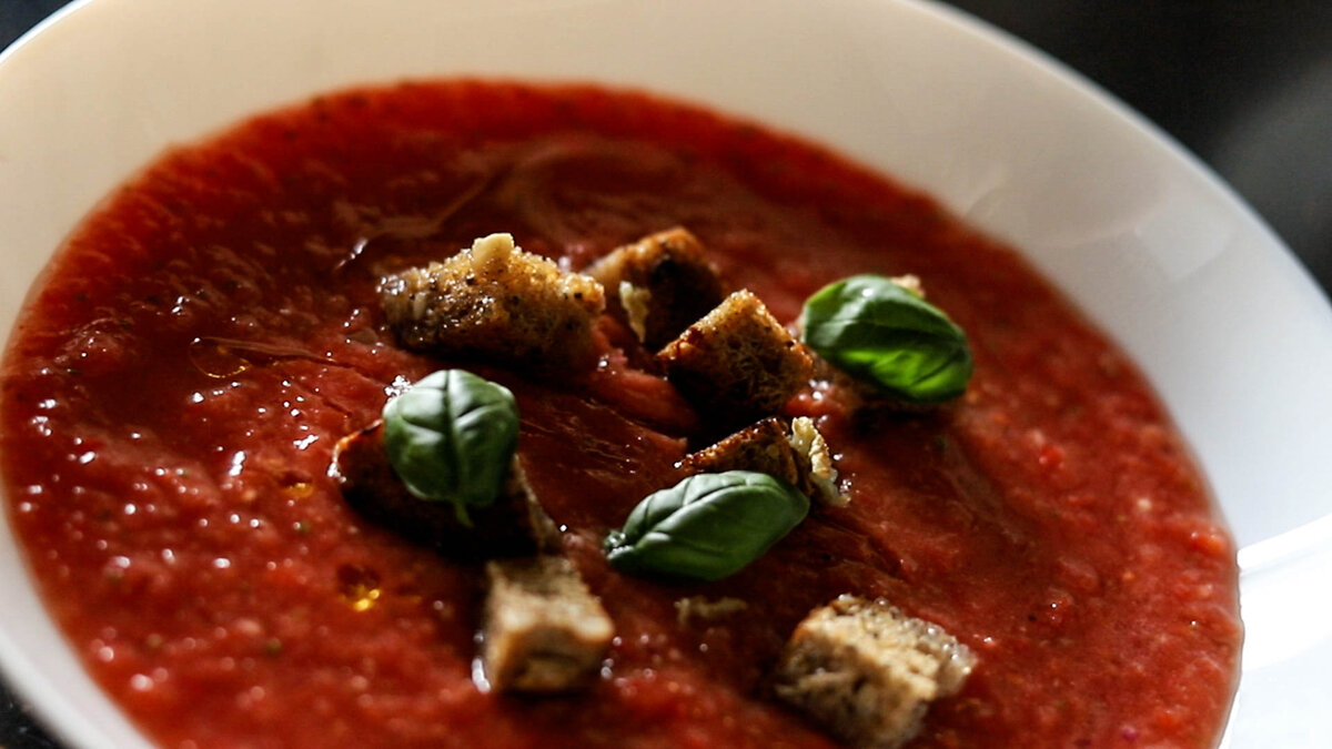 Помидоры режем, вырезая сердцевину. Помещаем все овощи в блендер, добавляем масло и лимонный сок. Взбиваем все в блендере до однородности. Разливаем по тарелкам(можно дополнительно охладить в холодильнике). Подсушиваем хлеб в духовке либо поджариваем на сковородке . Украшаем наш суп сухариками , зеленью (у меня базилик) и небольшим количеством масла.