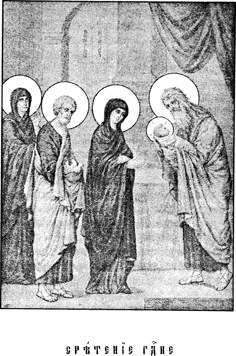 Ангел небесных небесные лики приникше на землю, зрят Своего Творца и Владыку перворожденна всея твари во объятиях Девических от Матери неискусомужныя, яко Младенца носима и ко храму во Иерусалим грядуща, и радующеся поют Тому и Царице Деве хвалу праздничную: