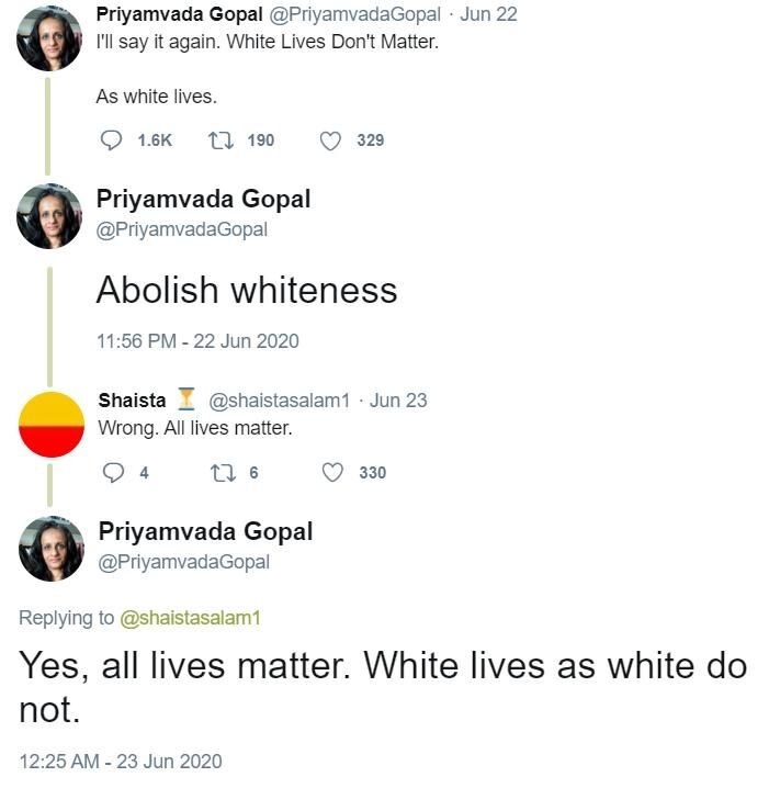Преподаватель, уроженка Индии, преподающая в Кембридже, написала, что «жизни белых не важны» и что нужно «отменить белизну», в итоге универ встал на её защиту. -И я скажу это вновь. Жизни белых не важны.