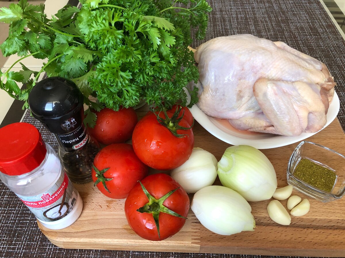 Здравствуйте, дорогие читатели! Сегодня готовим грузинское блюдо чахохбили. Стоп, стоп, стоп! Знаю, что многие из вас уже приготовились нажать на крестик и убежать с криминальными мыслями: «Нет! Часами стоять у плиты я не подписывалась!» И не надо. Поверьте, чахохбили готовиться очень быстро и просто. То есть без запарки👌 Я сама это только что поняла. Раньше даже рецепт не читала, думая, что это как холодец сварить, убив на это кучу сил и времени. Но недавно этот рецепт сам нашёл меня, а теперь надеюсь и вас, дорогие читатели. Нам понадобится: Курица - 1 шт. Лук - 3 шт. Чеснок - 3-4 зубчика Помидоры- 5 шт. Соль, перец, хмели-сунели Сливочное масло Кинза - 1 пучок Петрушка - 1 пучок Приготовление: Курицу разрезаем на кусочки. Разогреваем сковороду и слегка обжариваем курицу с двух сторон на сливочном масле. Режем лук полукольцами. Добавляем лук к курице, солим, перчим. Тушим 10 минут. Помидоры ошпариваем кипятком, очищаем от кожицы. Нарезаем кубиками и добавляем к курице. Посыпаем хме