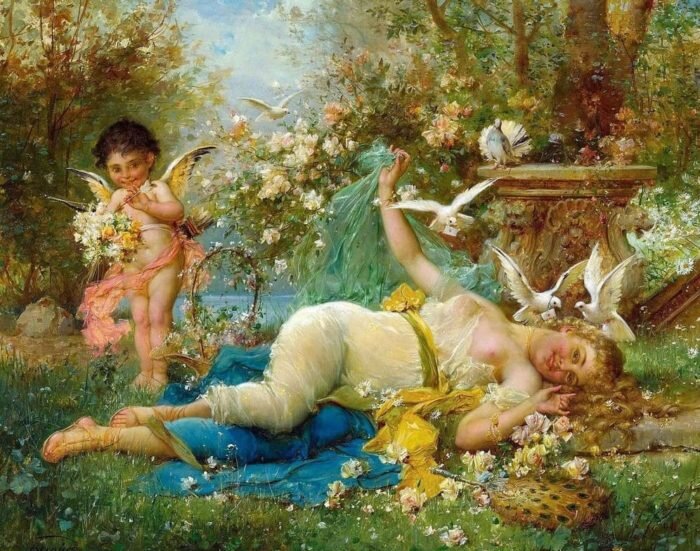 Художник Ханс Зацка (Hans Zatzka) – австрийский живописец, автор просто огромного количества картин в «салонном стиле». Его критиковали за «приторную слащавость». Критики не понимали – когда весь мир погрузился в кровь и грязь войны, обыкновенные люди тоскуют и мечтают не просто о мире без взрывов снарядов, а о мире прекрасном, идеальном, который будет похож на рай. И художник, в меру своего таланта, дарил людям эту мечту.