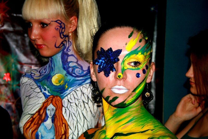 Для любой шоу программы естественно требуются участники. А иногда даже художники. На раскрашивание одной модели может уходить несколько часов. Полностью процесс я не видел, да и честно говоря, устал бы смотреть. Как устают девушки, я даже не могу представить. Про художника Оксану надо, наверное, будет сделать чуть позже отдельный пост. У меня много разных знакомых, но вот художников рисующих не телах девушек среди них кроме Оксаны нет. Естественно перед выходом в зал, девочки волнуются. В конце концов, мы же в клубе! Пара коктейлей, немного сигарет и можно будет идти в зал.
