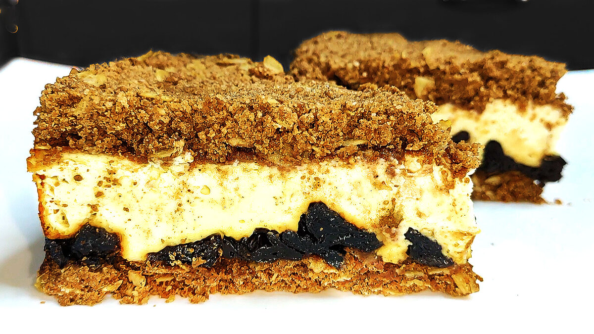 чернослив - 200-250 гр ПОШАГОВЫЙ РЕЦЕПТ ПРИГОТОВЛЕНИЯ В глубокую миску всыпаем муку, овсяные хлопья, сахар, какао перемешать. Добавляем сливочное масло и перетираем руками до образования мелкой крошки. Полученную крошку убираем в сторону. В глубокую миску выкладываем творог, всыпаем сахар, крахмал, добавляем сметану и перемешать ложкой до однородной массы. Подпишитесь на мой канал Ольга Лунгу Форму диаметром 20 см, дно застилаем пергаментной бумагой и высыпаем половину подготовленной крошки. На крошку выкладываем чернослив , творожную массу и сверху присыпаем оставшейся крошкой. Отправляе