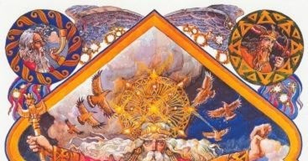 В начале времен мир пребывал во тьме. Но Всевышний явил Золотое Яйцо, в котором был заключен Род — Родитель всего сущего. Род родил Любовь — Ладу-матушку и, силою Любви разрушив свою темницу, породил Вселенную — бесчисленное множество звездных миров, а также наш земной мир. Солнце вышло тогда, из лица Его. Месяц светлый — из груди Его. Звезды частые — из очей Его. Зори ясные — из бровей Его. Ночи темные — да из дум Его. Ветры буйные — из дыхания.. «Книга Коляды» Так Род породил все, что мы видим вокруг, — все, что при Роде, — все, что мы зовем Природой. Род отделил мир видимый, явленный, то есть — Явь, от мира невидимого, духовного — от Нови. Род отделил Правду от Кривды. В колеснице огненной Род утвердил Гром гремящий. Бог Солнца Ра, вышедший из лица Рода, был утвержден в золотой лодочке, а Месяц — в серебряной. Род испустил из своих уст Дух Божий — птицу Матерь Сва. Духом Божьим Род родил Сварога — Небесного Отца. Сварог закончил миротворение. Он стал хозяином земного Мира, владыкой