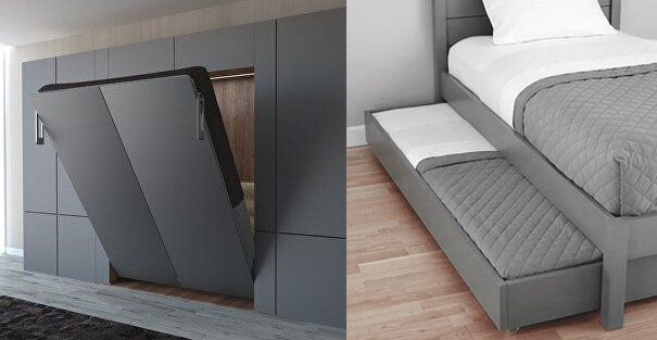 В маленьких квартирах часто возникает необходимость в дополнительном скрытом спальном месте. Например, если гости иногда остаются на ночь, а площадь комнат не позволяет разместить дополнительное полноценное спальное место. Сегодня рассмотрим несколько вариантов скрытых спальных мест для гостей в маленьких квартирах. Диван-кровать. Одним из самых популярных вариантов дополнительного спального места в квартире считается диван-кровать. На данный момент можно найти огромное множество различных вариантов. Главное всегда учитывать стилистические особенности комнаты при подборе дивана, а также габаритные размеры изделия (в том числе и в разложенном виде). Раскладной пуф. Менее распространенный вариант. Главным преимуществом размещения в качестве дополнительного спального места раскладного пуфа является компактность. Благодаря небольшому размеру такой пуф можно хранить даже под кроватью или в шкафу. Также данный пуф очень многофункционален - может служить в качестве подставки для ног или ж