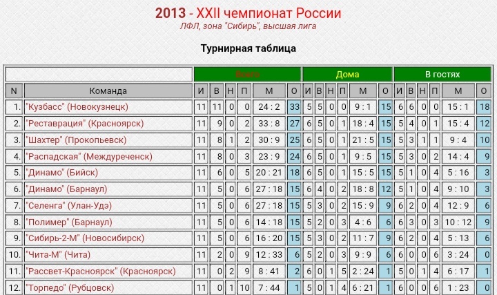 Всем привет, друзья! Пока весь русский футбол на паузе, мы решили рассказать вам историю ФК «Полимер»(Барнаул) в чемпионатах ЛФЛ. 2013 ГОД Сегодня мы расскажем о "XXII чемпионате России. ЛФЛ. Зона: Сибирь. 2013 год" Этот сезон проходил в 1 круг из-за того, что ЛФЛ снова меняло схему проведения соревнований. Система осень-весна в ЛФЛ не прижилась и в 2013 году решили перейти на систему весна-осень. На чемпионат заявилось 12 команд: ФК "Кузбасс" (Новокузнецк) ФК "Реставрация" (Красноярск) ФК "Шахтер" (Прокопьевск) ФК "Распадская" (Междуреченск) ФК "Динамо" Бск (Бийск) ФК "Динамо" Брн (Барнаул) ФК "Селенга" (Улан-Удэ) ФК "Полимер" (Барнаул) ФК "Сибирь-2-М" (Новосибирск) ФК "Чита-М" (Чита) ФК "Рассвет-Красноярск" (Красноярск) ФК "Торпедо" (Рубцовск) Все матчи ФК "Полимер" (Барнаул)(порядок правильный): ФК "Полимер" (Барнаул) 0:2 ФК "Шахтер" (Прокопьевск) ФК "Торпедо" (Рубцовск) 0:2 ФК "Полимер" (Барнаул) ФК "Сибирь-2-М" (Новосибирск) 1:2 ФК "Полимер" (Барнаул) ФК "Полимер" (Барна