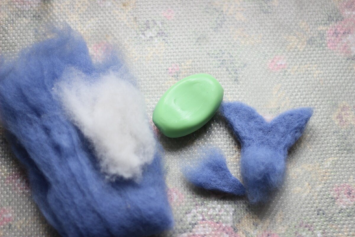 Как давно я хотела это сделать! А мои вечно грязные после долгих летних прогулок дети сильно замотивировали меня))) Не знаю, как у вас, а у меня они не очень-то любят отмывать въевшуюся грязь с коленок и прочих частей тела при помощи разных мочалок. И тогда я решила сделать самостоятельно такие мочалки, которыми им захочется мыться качественно) Эта идея не новая, я просто облекла её в забавную форму) Покажу, как валять такие штуки на примере кита для старшего сына. Итак, нам понадобится: кусочек мыла, тёплая вода и шерсть для валяния. У меня это латвийский кардочёс, можно использовать шерсть и в ленте. Я валяю на ребристой подложке из Икеи, но можно использовать упаковочную пупырчатую плёнку. Хвост и плавник я предварительно слегка подваляла иголками, чтобы было проще в дальнейшем. Мочим пласт шерсти и оборачиваем им мыло.Лучше делать это с помощью подмыленных пальцев, чтобы шерсть не прилипала к рукам. Дальше я выкладываю пузико белой шерстью и прикладываю плавник. Шерсть на кончике х