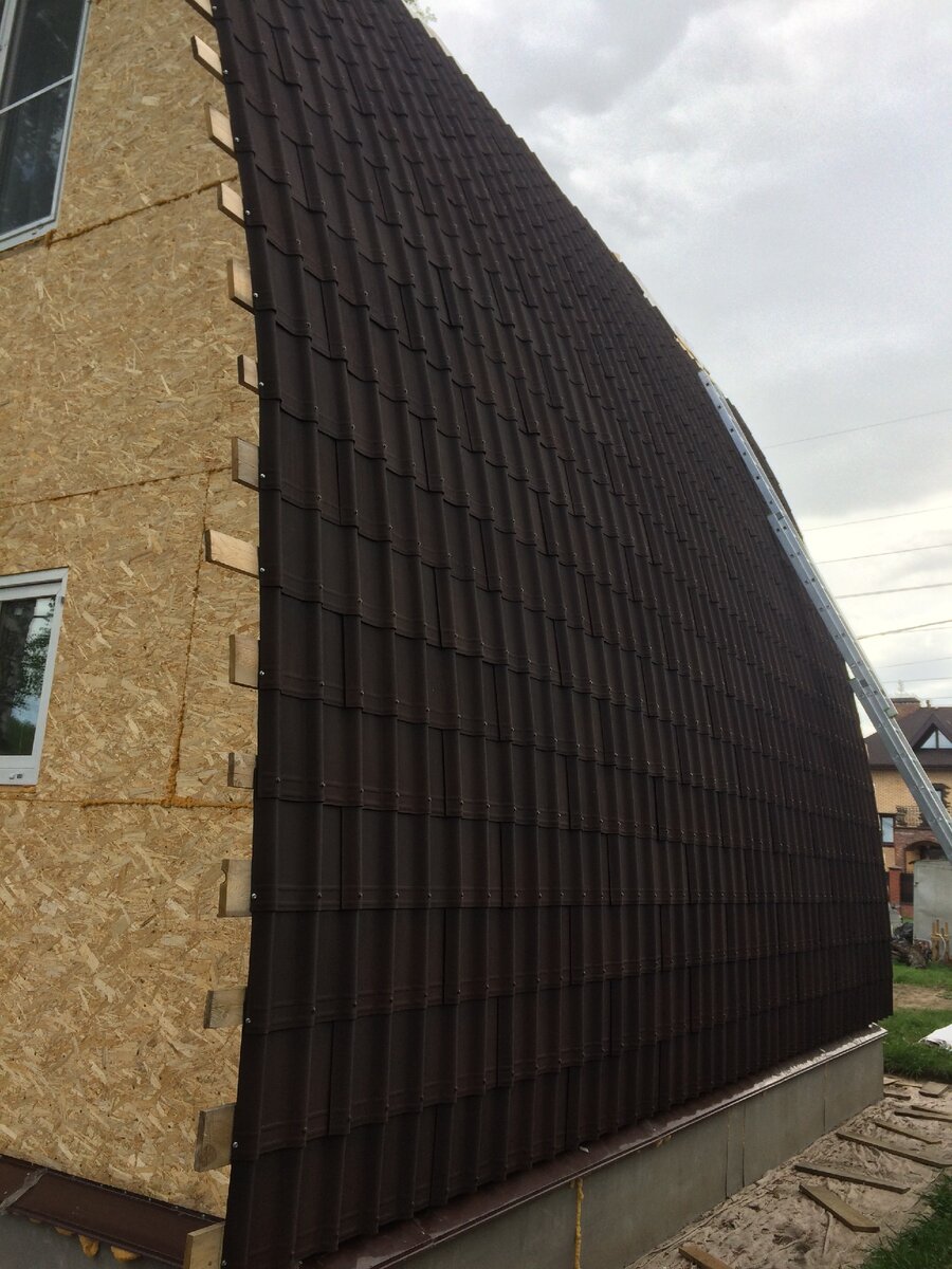 Итак, почему же именно на черепице Ондувилла мы остановились. Изначально рассматривали и просчитывали разные варианты: клик-фальцевую кровлю, металлочерепицу, мягкую кровлю типа Шинглас, ну и конечно Ондувиллу. Ондулин, профлист и какие то экзотические варианты не рассматривали. Очень понравился вариант с клик-фальцем цвета мокрый асфальт, но... Но ценник выходил очень приличный, да и в одного крепить длинные карты не реально. Металлочерепица по цене значительно дешевле, да и при желании можно было заказать 2-х метровые листы, что бы работать одному.
