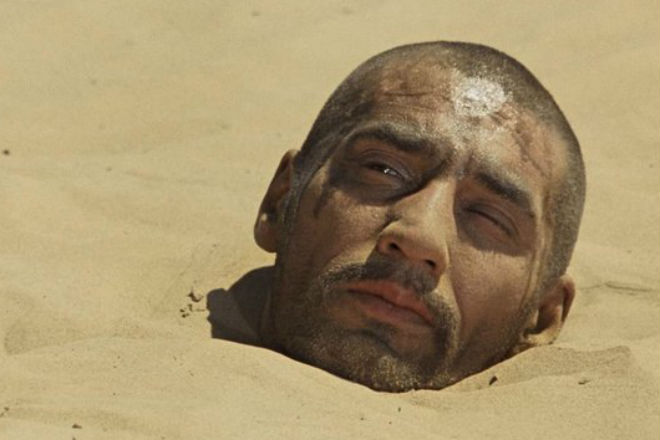 Завеса оседает. Голова Максима торчит из песка, под толщами которого скрыто его тело. Он рычит и дёргает головой, безрезультатно пытаясь выбраться.