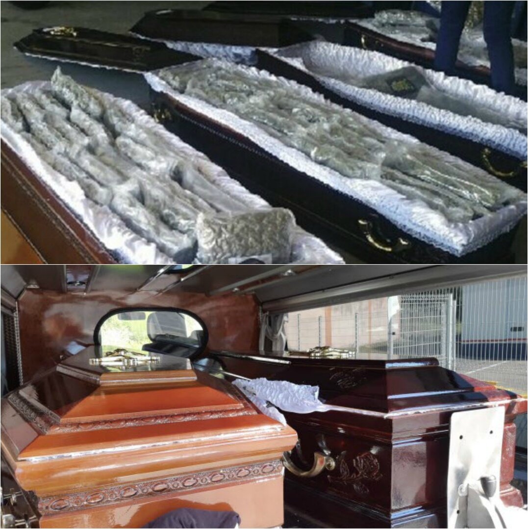 Подозрение вызвало нервозное поведение водителя Осмотрев автомобиль, таможенники обнаружили, что катафалк не снабжен холодильными установками с температурным режимом. Более того, четыре гроба имели идентичные ручки и странные замки. Решив вскрыть гробы, таможенники неожиданно увидели 71 килограмм марихуаны, который был бережно расфасован по пакетам. По предварительным данным, в катафалке лежал груз примерно на 700 тысяч евро (~ 55 млн рублей). Водителем автомобиля оказался гражданин Румынии, который следовал во Францию из Испании.