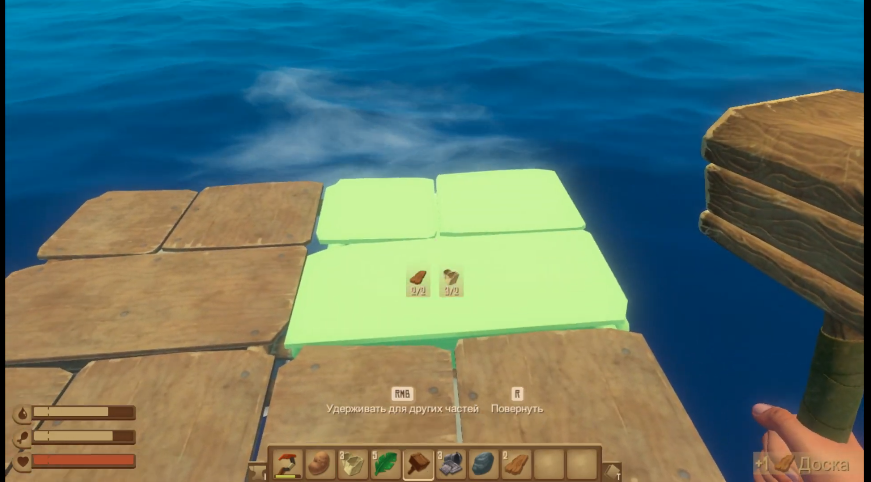 Всем привет. Тут Raft подплыл на мой канал, кстати, вот он. Люблю я, значит, выживалки, интересно побегать, покрафтить, но терпеть не могу зомби и любые игры с зомби. Но рафт отличается от всех, тут нет зомби, тут есть последствие катастрофы и твоя жизнь зависит только от тебя и твоего напарника ( ну и от акулы) И так, с чего мы начали. Сначала я не много половил отходов что бы не много увеличить плод, так как вдвоём на 4 квадратах не удобно: Пока ждал своего напарника, наш плод наткнулся на остров, вот удача, подумали вы, но не тут то было, на острове растут деревья, но их можно срубить только топором, а для топора нам не хватало пару камней, да ещё и акула уже плод почти доела: Забрав пару ананасов и арбуз мы двигаемся дальше. Ночь, шторм, всё как должно быть на старте. Спустя ночь, мы наловили инструментов на стол и опреснитель, хоть от жажды не помрём и уже хорошо: Нашли новый остров, рассчитывали что найдём сундук и свалим. Но как бы не так. Ни сундука, ни топора, ни якоря. К