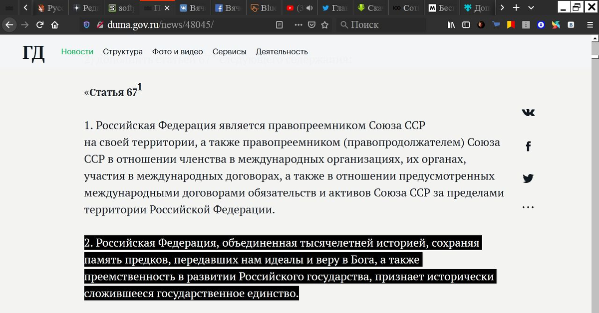 АКТУАЛЬНОЕ Для начала, чтобы знать, ЗА или ПРОТИВ чего нам предложено голосовать 1 июля сего, 2020 года, было бы правильно ознакомиться с их полным текстом. А сделав это – хорошенько обдумать прочитанное. Прежде, чем отправиться на избирательный участок или проигнорировать это важное мероприятие. http://duma.gov.ru/news/48045/ Все соотечественники, кто хотя бы немного интересуется общественной и политической жизнью в России – несомненно знают о пресловутой и одиозной «поправке Терешковой», позволяющей ныне действующему Президенту РФ вновь, уже в пятый раз, избираться на высший государственный пост в стране. Именно поэтому – я не стану развивать здесь эту тему и повторять сказанное самыми разными людьми, множество раз. Ибо «переливать пустое в порожнее» – дело неблагодарное, но, что куда более важно – сама суть большинства поправок – полностью закрывает великую советскую эпоху, утверждая безусловное торжество капитализма в России уже на высшем юридическом уровне. Что, по моему личном