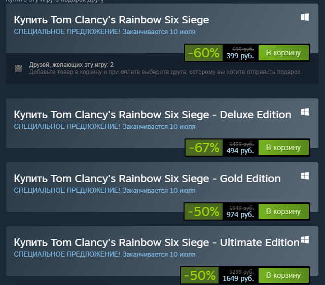 Сейчас в стиме действует летняя распродажа! В стиме продаются разные игры со скидкой, и наша Осада тоже. За стандартную версию игры просят - 399 рублей. За Делюксовое издание ипры просят - 494 рубля. За Золотое издание игры просят - 974 рубля. За ультимативное издание игры просят - 1649 рублей. Отличаются эти издания наличием оперативников и сезонным пропуском: Standard Edition Rainbow Six: Осада (Основная игра) Обратите внимание, что базовых оперативников необходимо приобрести отдельно за внутриигровую валюту.