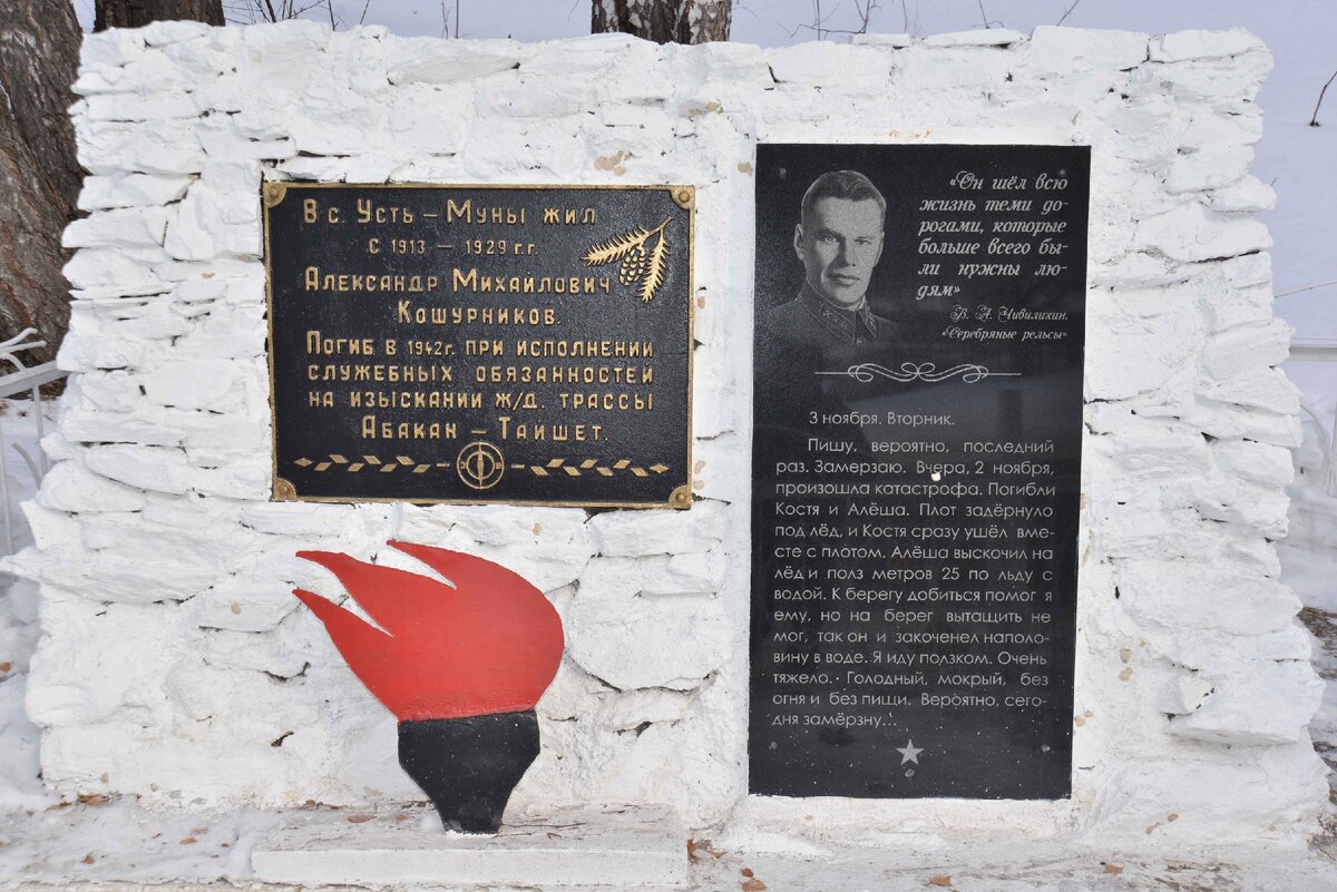 Проезжая село Муны, что расположено на Чуйском тракте, на адресных табличках домов читаем: «улица Кошурникова». А в тени деревьев и кустарников у скалы Мунинского бома, что разделят современной село на две части, обращает на себя внимание огороженный памятник – с мемориальной доской.