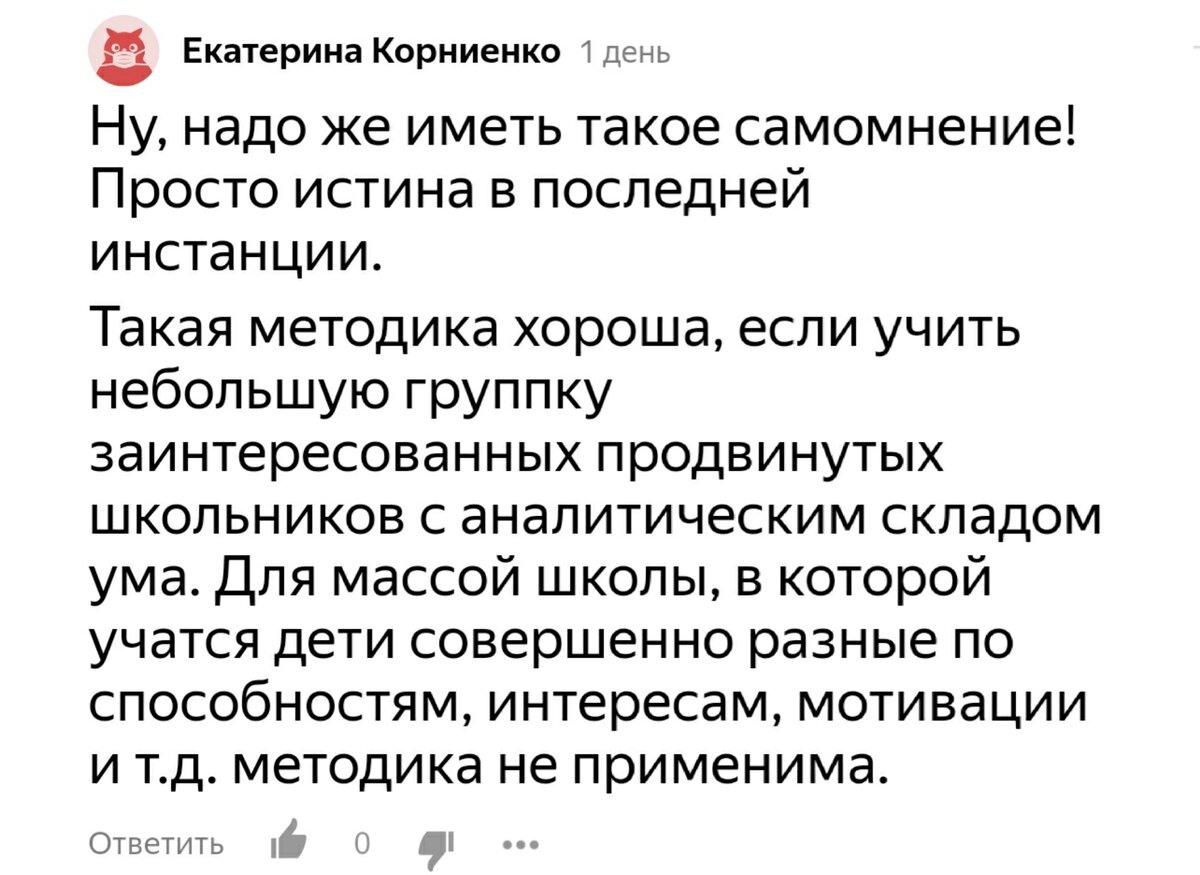 Я кратко объясню, почему так надо: комментаторы верно подмечают, что индивидуальные методики работают только с заинтересованными детьми, но чего они не видят - это как заинтересовать 30 "дебилов". И за короткий срок это действительно сделать трудно, поэтому понадобится потратить примерно три года на то, чтобы заинтересовать 29 из 30 человек.