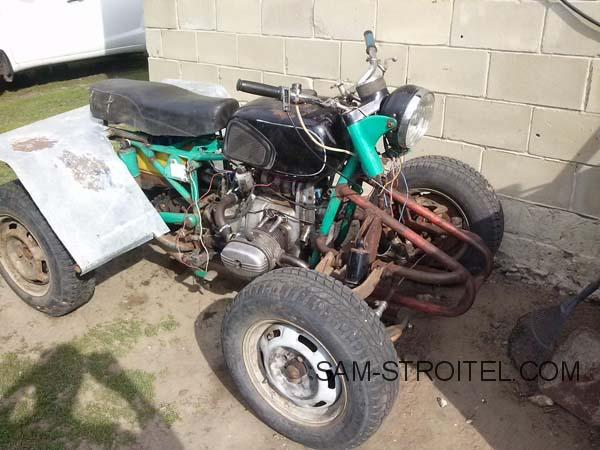 Приветствую любителей самодельной авто мото техники! Сегодня хочу показать самодельный квадроцикл построенный одним из умельцев. В качестве донора для самоделки, автор использовал мотоцикл «Урал». Мотоциклетная рама была доработана, сделаны крепления для рычагов подвески квадроцикла. Также в этой конструкции использованы запчасти от автомобиля ВАЗ классика: колёса, рычаги подвески, полуоси, ступицы и пр. На фото: передняя подвеска квадроцикла. Задний мост. Силовой агрегат от мотоцикла «Урал», его мощность составляет приблизительно 32 л.с. Недостатком этого ДВС является довольно высокий расход топлива и периодический перегрев. Чтобы понизить обороты двигателя, дополнительно установлен боротовой редуктор от ЛуАЗа. В целом, получился отличный аппарат для поездок по бездорожью, конечно привод здесь только задний, но мощности двигателя вполне достаточно для такой техники. Автор самоделки: Алексей Податнов.