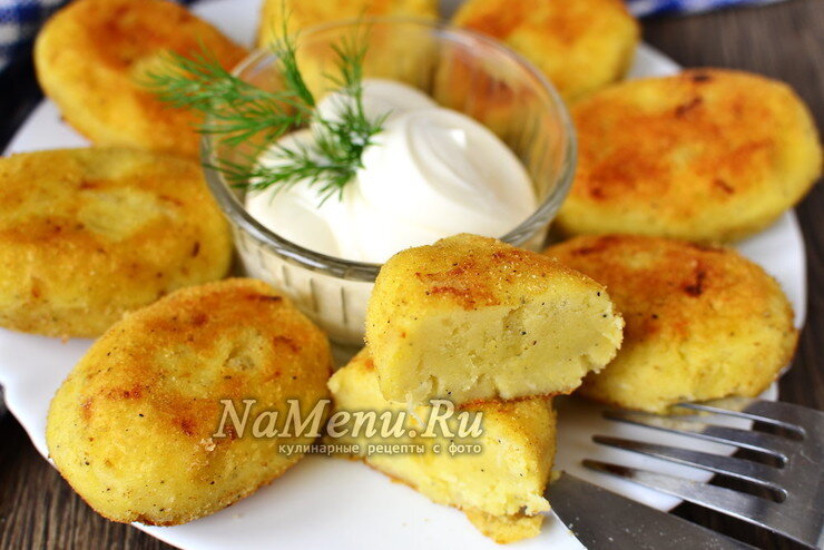 Ингредиенты: 🥔Предварительно отварите картофель в мундире, остудите, очистите и сделайте пюре. Далее наше пюре пропустите сквозь сито 🧅Лук очистите, нарежьте мелкими кубиками. Поставьте на огонь сковородку, растопите в ней сливочное масло, высыпьте в неё лук и пассируйте до золотого румянца 🥚В картошку разбейте поочерёдно по одному яйцу, перемешайте, добавьте поджаренный лук и опять перемешайте 🍶Посолите, поперчите, добавьте специи по вкусу. И еще раз перемешайте 🥄Наберите в ложку полученный фарш, обваляйте будущую котлету в панировочных сухарях и отправьте на жарку в разогретую с подсолнечным маслом сковороду 🔥Жарьте на среднем огне с обеих сторон, до золотистой корочки https://namenu.ru/10254/Kartofelqnyee_kotlety_iz_kartoshki_v_mundire/
