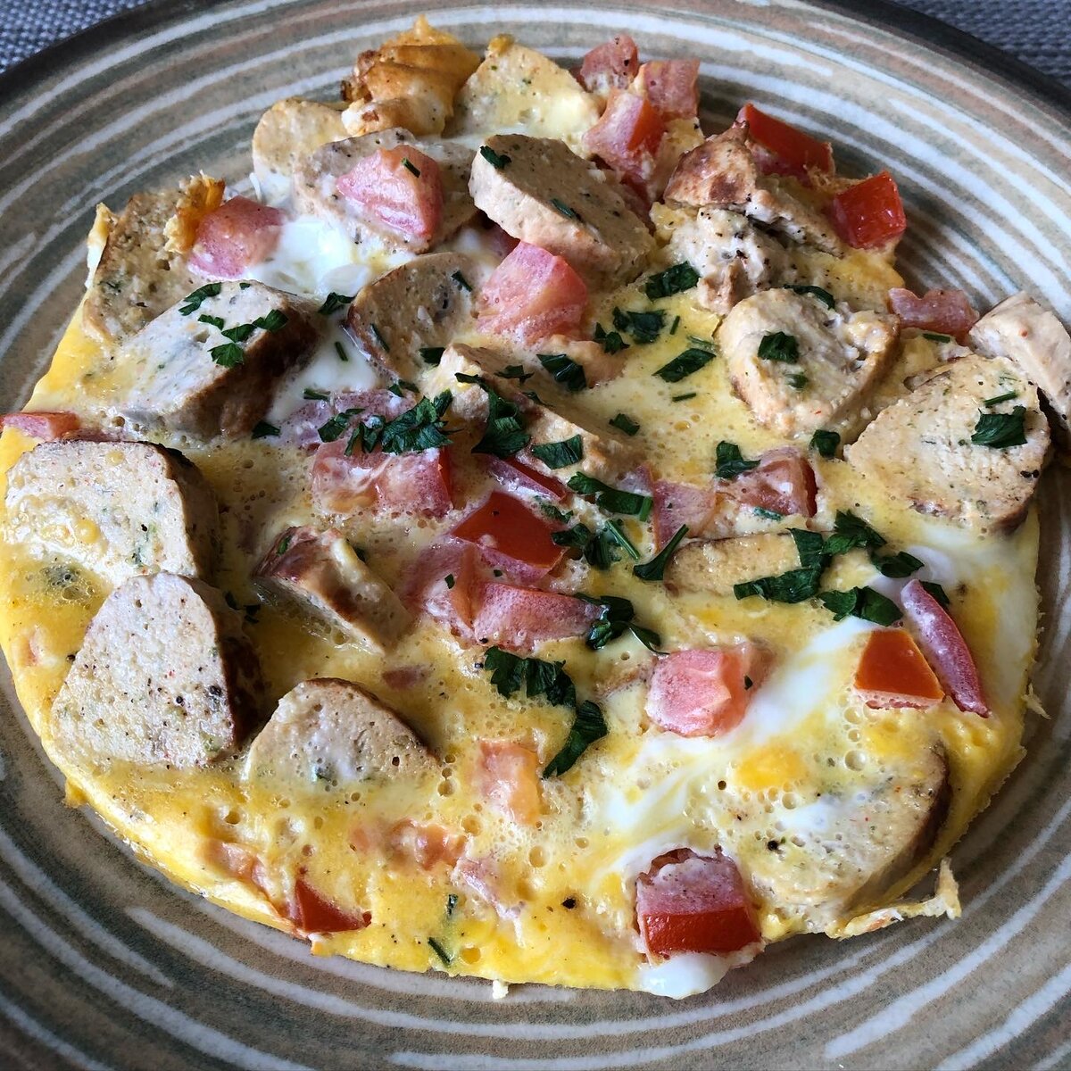 КБЖУ неизвестен! Достаем из холодильника два яйца. Что-нибудь еще съедобное, в моем случае: •Две сосиски куриные •Половина помидора •Ветка петрушки 🔥Обжариваем сосиски на ап сковороде •Добавляем что-то съедобное и тоже слегка обжариваем. •Разбиваем два яйца, солим, перчим и все перемешиваем. •Закрываем крышкой и готовим 10 минут на среднем огне.