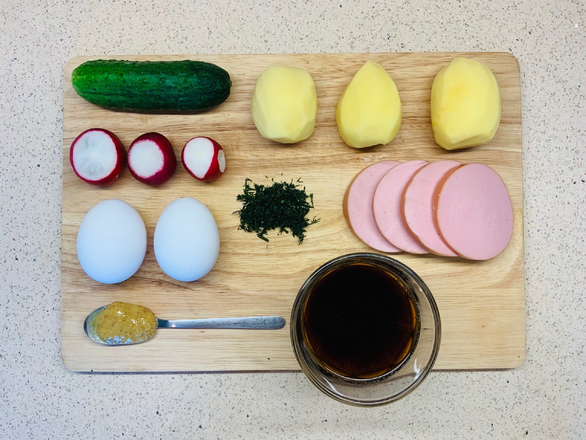 Хотите удивить своих родных или дорогих гостей? Это можно сделать даже с банальной окрошкой! Ингредиенты на 2 взрослых и 1 детскую порцию: У окрошки нет единственно правильной пропорции продуктов, это всего лишь один из вариантов, который нравится нашей семье. Приготовление: 1 шаг: Первым делом ставим отвариться яйца. Минут 15 будет достаточно. Тем временем нарезаем сырой картофель мелким кубиком и отправляем в кипящую подсоленную воду на 5-6 минут. 2 шаг: Как только картошка свариться, откидываем её на дуршлаг и промываем холодной водой, чтобы остановить процесс приготовления. Нарезаем все наши продукты мелким кубиком и смешиваем вместе с картошкой. Главное, оставить целым один желток, он нам пригодится в следующем шаге. 3 шаг: Растираем отложенный желток вместе с горчицей, укропом и щедрой щепоткой соли. Затем добавляем нужное нам количество кваса и размешиваем до полной однородности. Пробуем на соль, если надо корректируем. 4 шаг: Теперь дело за подачей. Наливаем этот квас в любо