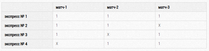 В том случае, если Вы на 100% уверены в одном или нескольких матчах, количество таких вариантов можно исключить и убрать из таблицы те/ту ничью, где будет Ваш «верняк».