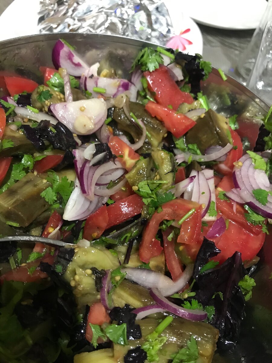 Помидоры и лук нарезать полукольцами, затем смешать с баклажанами, добавить мелко порубленную зелень и чеснок.