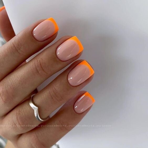 Нюд - отличный вариант маникюра на все времена. Безупречный и ненавязчивый, но в то же время маникюру можно добавить яркий акцент. Нюд подходит и для работы, для вечеринок, для свадьбы и на все случаи жизни. Вот вам несколько идей как придать нюду изюминку. 1. Цветной френч Отличный вариант для тех, кто не хочет перегружать ногти яркими цветами, но при этом хочет сделать яркий акцент. Такие ручки точно не останутся без внимания!). Френч хорошо смотрится на любой форме ногтей. Подходит такой вариант и любительницам классического френча, которым он наскучил. Примерное время выполнения – 2 -2,5 часа. 2. Фольга