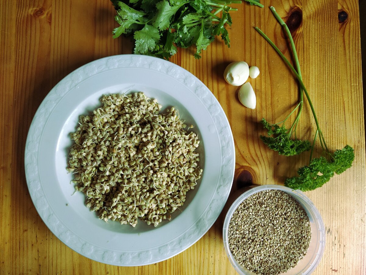 Ещё один полезный рецепт "живой" кухни. Пророщенная гречка заслуживает того, чтобы стать постоянной частью рациона каждого, так как в ней масса полезных свойств. Очень подробно об этом можно почитать здесь. Данный рецепт является сыроедческим - все продукты в нём содержатся в первозданном виде, не подлежат термообработке и поэтому не теряют своих полезных свойств. Даже если вы не сыроедите, непременно приготовьте этот хумус, чтобы испытать на себе прилив энергии и этот невероятный потенциал, который даёт живая еда! Потребуется: серый кунжут, пророщенная гречка, любая зелень (петрушка, кориандр), пол стакана оливкового масла, долька чеснока. Ингредиенты берутся на глаз. Сперва приготовим тахину - кунжутную пасту, которая лежит в основе блюда. Кунжут мелем в кофемолке, перекладываем в блендер, добавляем оливковое масло и чеснок и измельчаем в пасту. Добавляем мелко порезанную зелень и гречку и делаем то же самое: Консистенцию можно сделать более нежной, тогда хумус из сырой гречки будет
