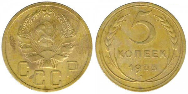 Монета номинала 5 копеек, выпускаемая в 1935 году, имела два варианта. С этого года началась чеканка монет нового образца. Пятак стал самой тяжёлой монетой, выполненной из данного сплава.