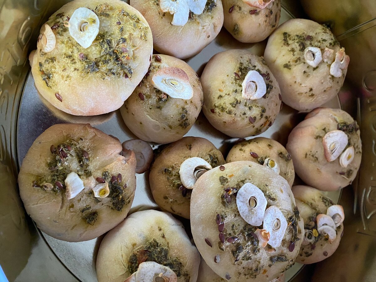 Ароматнейшие домашние булочки, ммм! 📌Вам понадобятся: Приготовление: Просеять оба вида муки, добавить соль. Дрожжи растворить в тёплой воде, добавить сахар. Объединить все, замесить тесто и добавить оливковое масло. Оставить в тёплом месте на часок - полтора. Сформировать булочки, смазав руки маслом. Украсить чесноком/ семечками/соусом песто, чего душа желает😁 Выпекать ≈15 мин температура 200С. Бон аппетит!