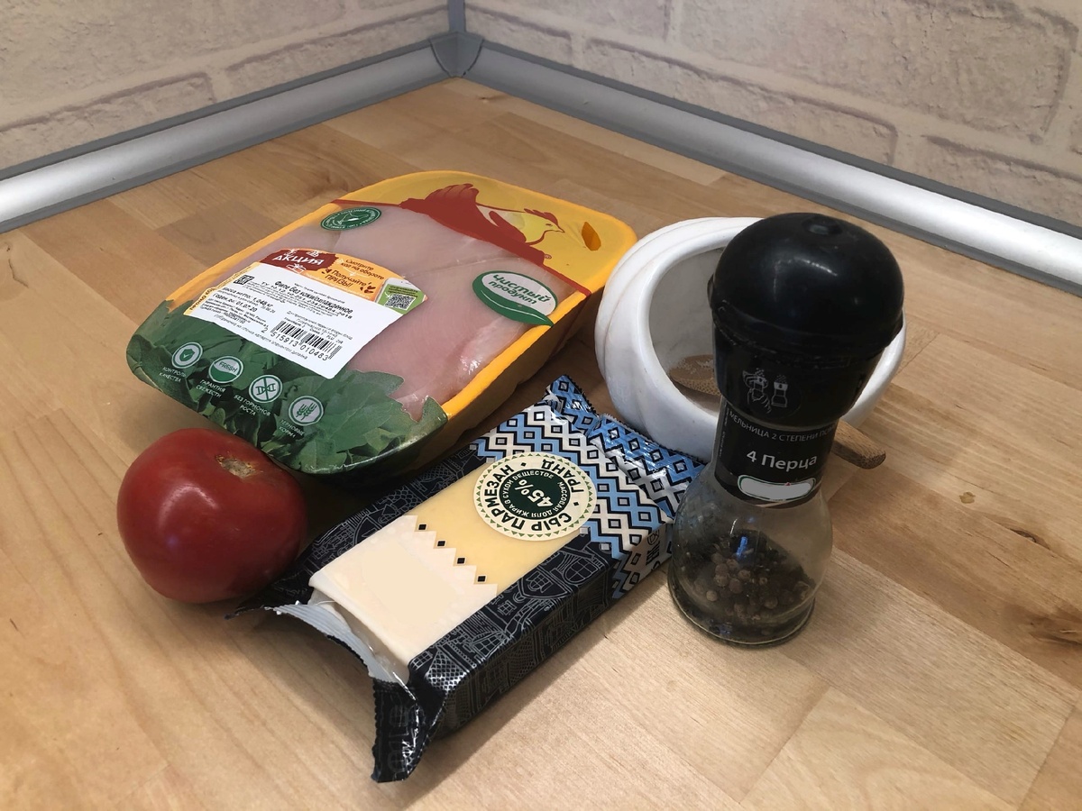 Под помидорно-сырной корочкой Ингредиенты: Количество порций: 6; Время приготовления: 1 час. Также мне понадобились: противень, фольга, тёрка, нож для мяса, нож для томатов, пищевая пленка, молоточек для отбивания, доска разделочная. 1. Чтобы не летели брызги, накрыла филе пищевой пленкой и отбила молоточком с двух сторон. Так как куски получились большие, разрезала каждый пополам. Поставила разогреваться духовку до 180°С. 2. Посыпала каждый кусок с двух сторон солью и смесью перцев и разложила на противне. 3. Пока разогревалась духовка, натёрла сыр и нарезала помидор тонкими кольцами. 4. Аккуратно разложила кольца помидора на куски куриного филе и посыпала сверху тёртым сыром. Отправила предварительно разогретую до 180°С духовку на 40 минут. 5. Ужин готов!