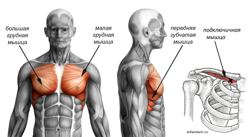 Движемся сверху вниз, на очереди грудные мышцы. Не буду долго тянуть, поехали разбираться… Горизонтальный жим лежа (штанга) Ширина хвата подбирается индивидуально, главное, чтобы в локтевом суставе не образовывался острый угол, то есть запястье должно располагаться над локтем, когда штанга находится в самом нижнем положении.