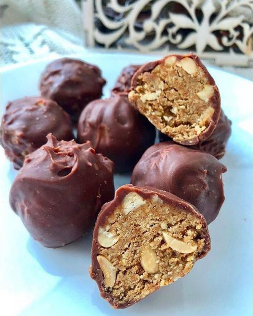 Рецепт очень прост! Ведь для приготовления потребуется всего 4 ингредиента!!! Записывай! *150 грамм обжаренного арахиса; *4 ст л с горкой сухого молока; *2 ст л жидкого мёда (можно использовать жидкий подсластитель) *плитка тёмного шоколада Приготовление : Сухое молоко обжарить на сковороде до карамельного цвета, после чего перемолоть в блендере (потому что при жарке на сковороде появляются комочки), добавив 1/3 арахиса. Смешать молоко мед и оставшийся арахис и сформировать конфеты. Шоколад растопить на водяной бане и покрыть им конфеты. Убрать в холодильник до застывания. Всё!!! 🤗 Приятного аппетита!)))