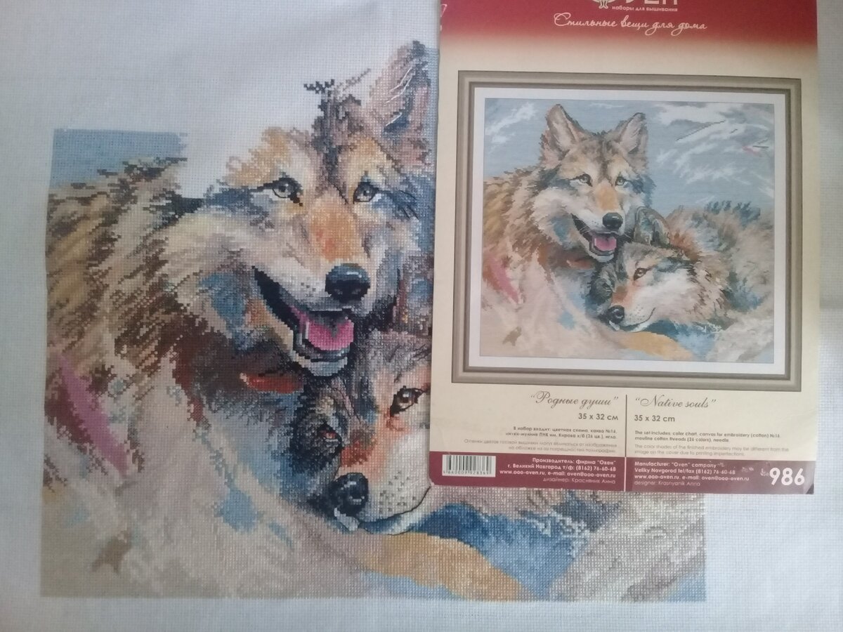 Всем привет! Сегодня приоткрою вам дверь в мою вышивальную жизнь и поделюсь теми процессами, которые находятся у меня в работе на данный момент. Надо сказать, что человек я абсолютно не системный, нарушаю собственные планы, обещания, ведомый вышивальной музой и вдохновением. Поэтому не ждите от меня каких-либо подсчетов крестиков, ротации, сроков финишей и тому подобное. Должно же хоть где-то быть место свободе самовыражения? Вопрос риторический! Ну, что, поехали! 1. "Родные души" фирмы "Овен". Начинала я этот набор еще тогда, когда жила в Тамбове. Как известно, один из символов этого края - тамбовский волк, который, как известно, нам товарищ. Но совсем не этот момент был решающим при покупке набора. Дело в том, что мне хотелось вышить семейную картину, которая бы хранила брак. При всем моем уважении и любви к лебедям, но этот символ верности немного наскучил. А вот про волчьи пары говорят не так уж много. И зря! А вы знали, что волки так же выбирают себе пару одну на всю жизнь? Вот т