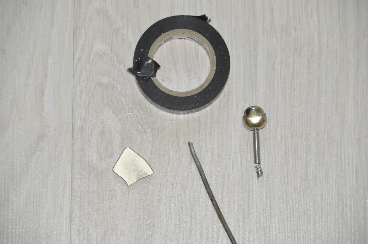 Изолента, кусок стальной проволоки, бубенчик и неодимовый магнит. Магнит можно заказать в интернете, или разобрать старый компьютерный жёсткий диск.